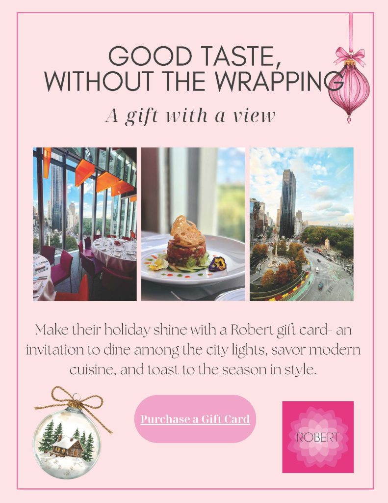 Atop The Museum of Arts and Design at Columbus Circle, Robert is a classic modern American restaurant offering breathtaking views of Central Park and Columbus Circle. Elegant, sexy, and romantic, Robert celebrates design, beauty and culinary delights. Dine on a menu created by Chef Armando Cortes or simply sip signature cocktails while you watch the sunset and revel in the beauty of the city.